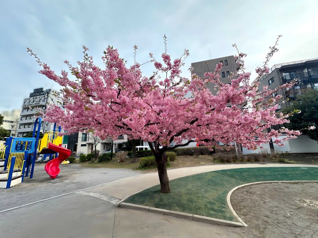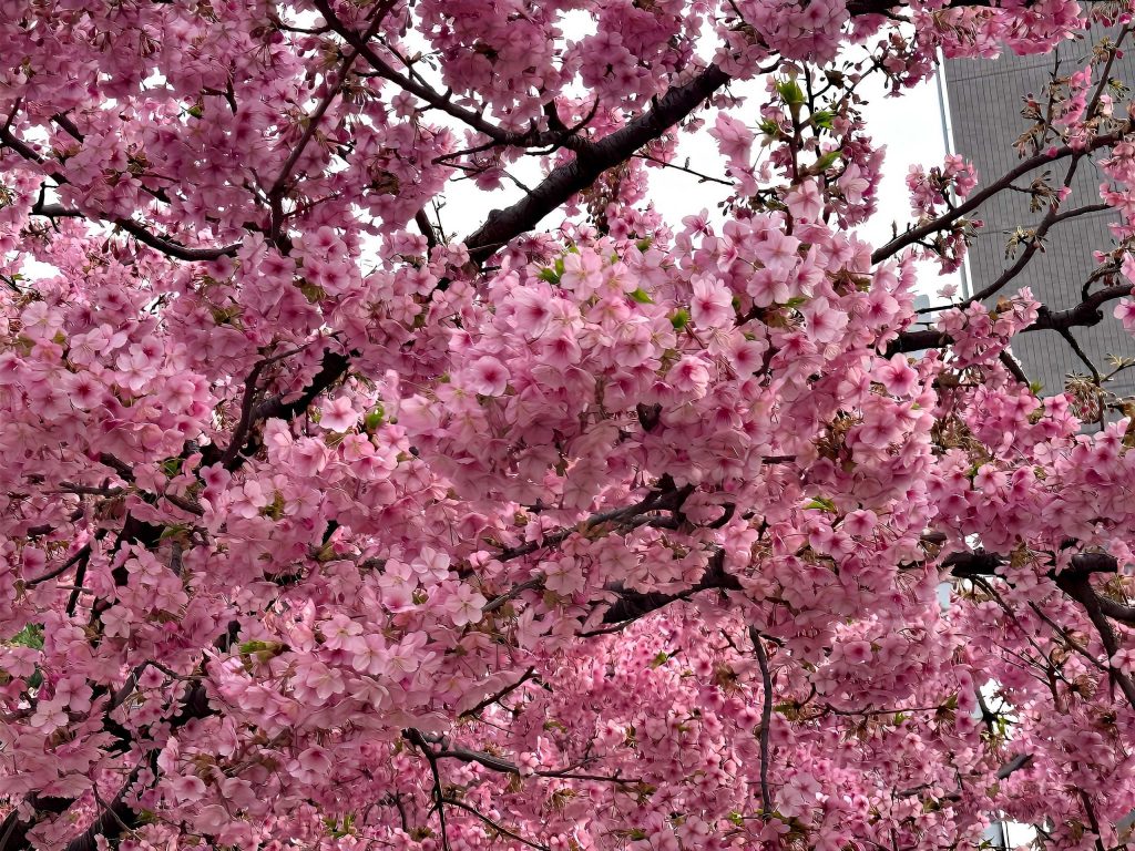 河津桜はソメイヨシノよりも早く咲くので、まだ冬の空気が残る街の中でひと足先に春を知らせてくれます。遠くから見ても存在感があり、枝いっぱいに咲いた淡いピンクの花がとても印象的でした。